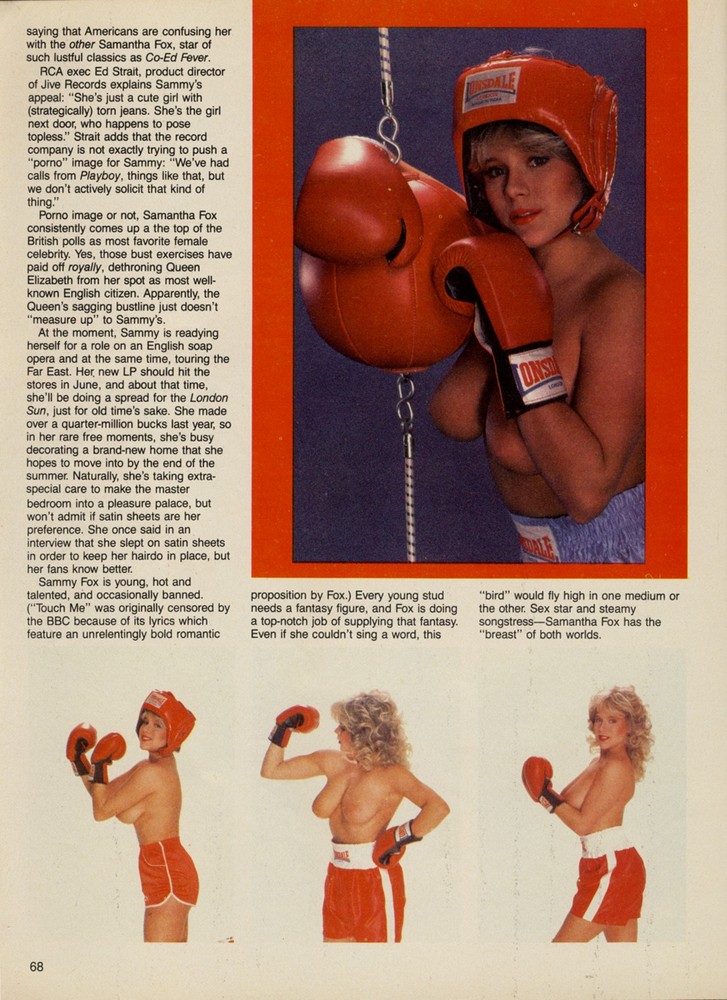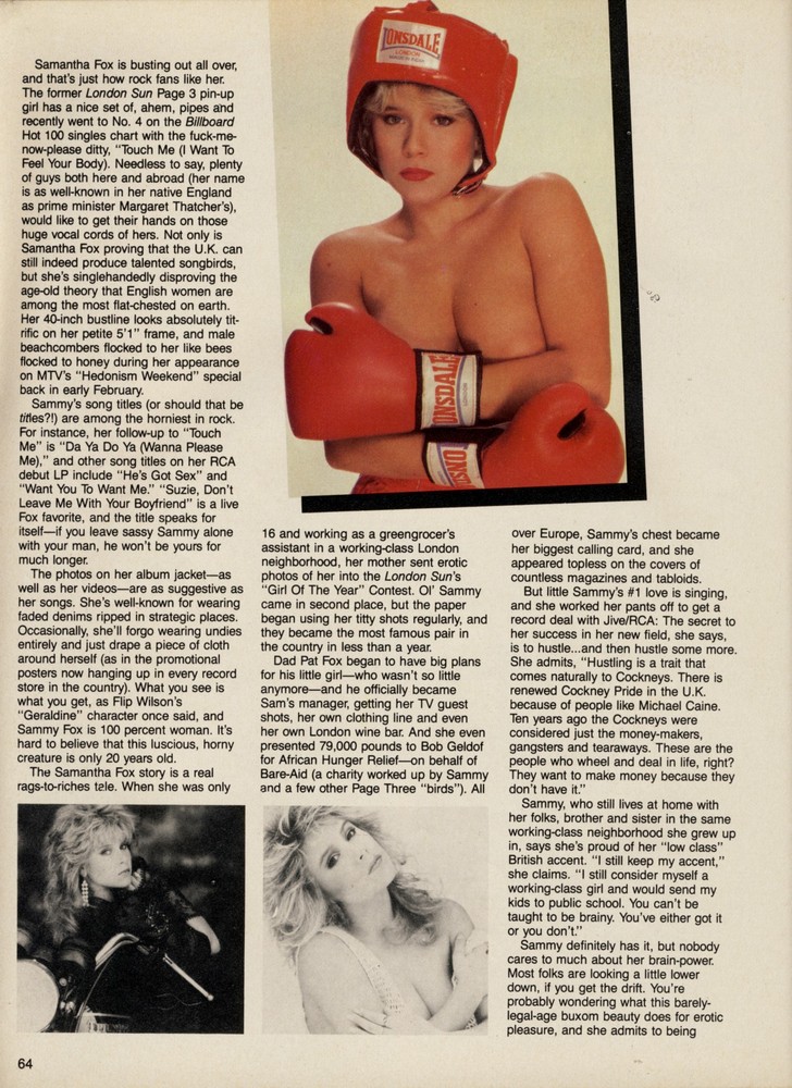 Саманта Фокс - британская модель и певица, известная своими фотографиями для глянцевых журналов, таких как «Плейбой», XXL и «Максим». Она снималась обнаженной, демонстрируя свою фигуру.